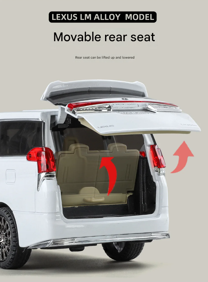 Discover the luxury and craftsmanship of the Lexus LM300 and Toyota Alphard in this highly detailed 1:24 scale diecast model. Whether you're a collector, a car enthusiast, or shopping for the perfect gift, this model blends realistic features with interactive elements that truly bring it to life.